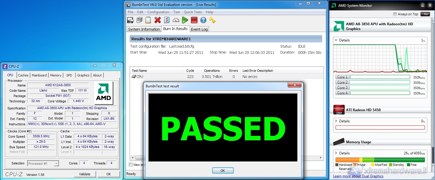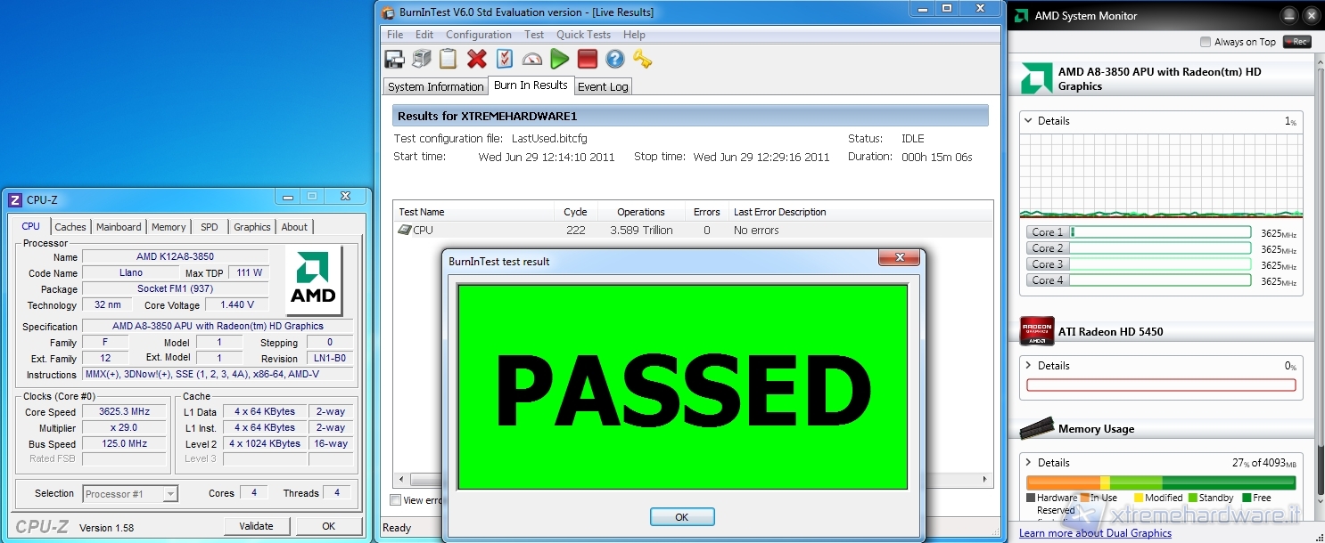 After installing the HD 5450 we have increased in increasing steps the system bus. To check the stability of the system we have used the BurnInTest V6.0 software able to put the CPU under stress.