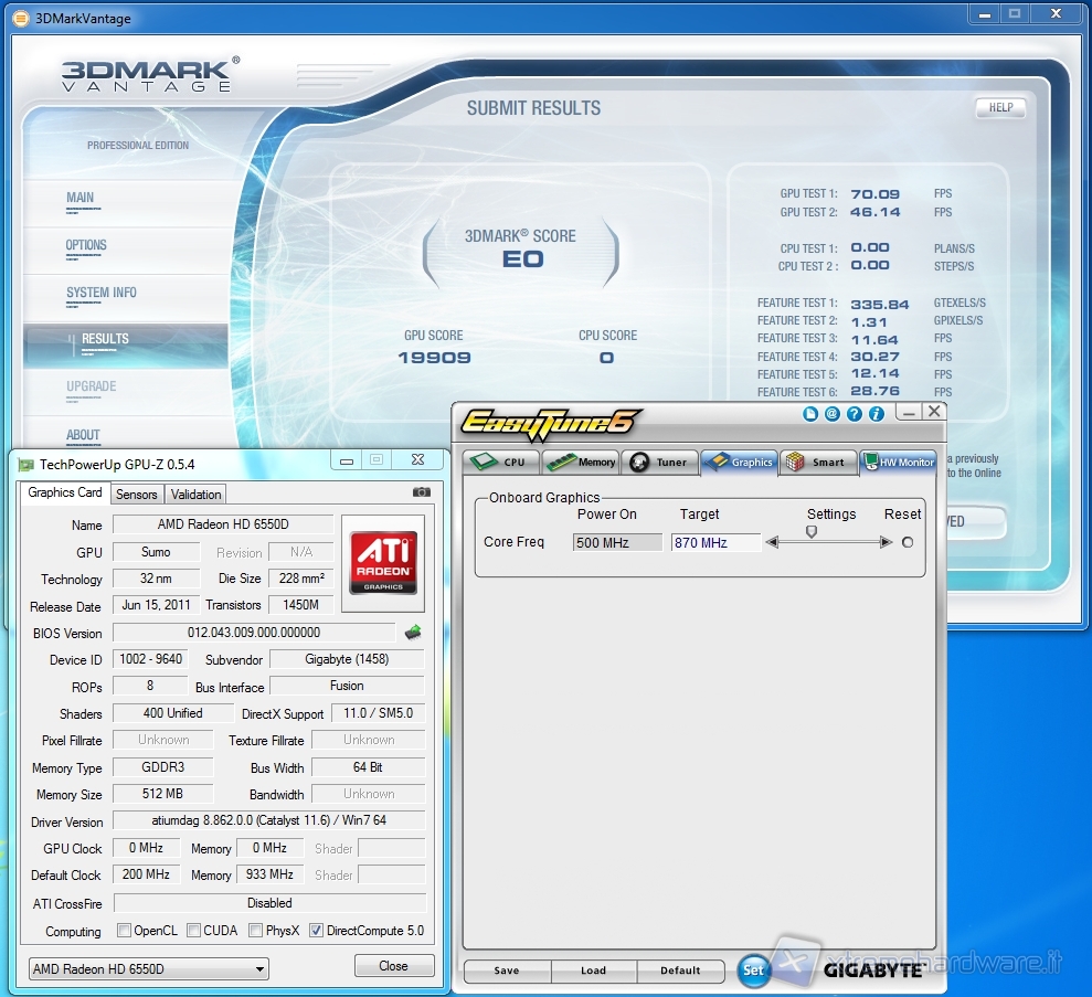After the CPU overclock we removed the dedicated Radeon HD 5450 and, once brought back the CPU frequency to the default, we did overclock the GPU acting only on it, managing to bring the frequency to 870MHz.