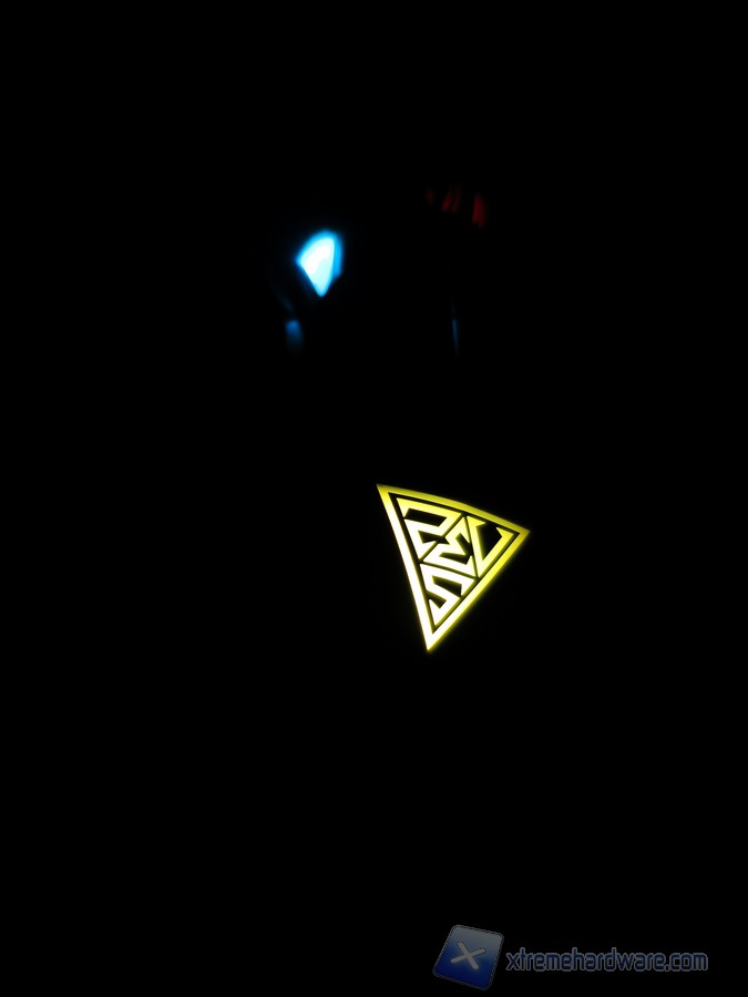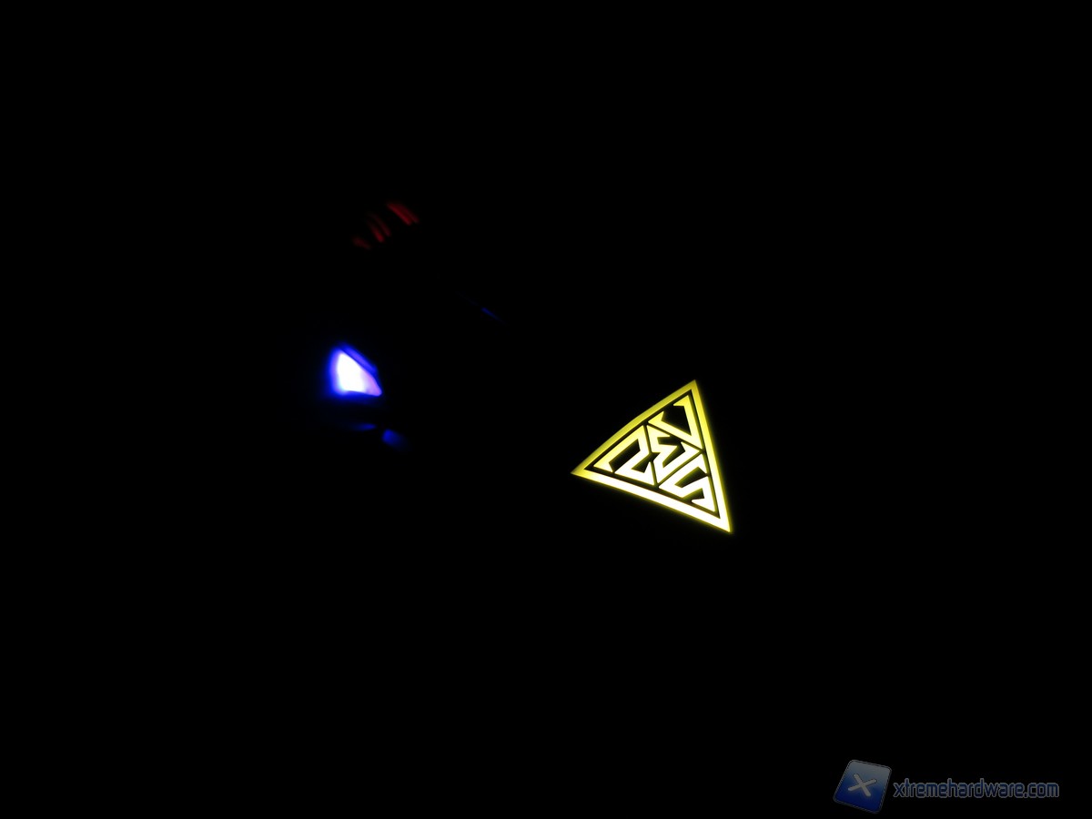 Prima di analizzare la parte inferiore, vi riportiamo alcune immagini della parte frontale del mouse che come notiamo è dotata di due LED di colore rosso (che non potranno essere modificati). Il “muso” del mouse è dotato anche di una forma molto aggressiva caratterizzata ulteriormente dal logo del brand serigrafato su un rilievo di plastica. Come già detto, GAMDIAS si ispira ad antichi miti greci, concretizzando tale ispirazione con un design molto particolare dei propri prodotti.