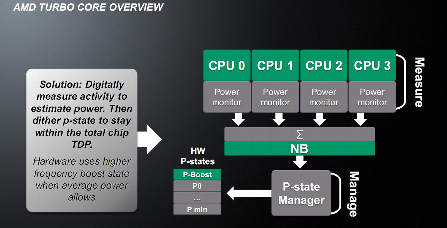 Questo perché la prima implementazione del TurboCore era molto conservativa, in quanto non verificava in tempo reale il consumo effettivo. Quindi le condizioni di intervento e il margine di incremento di clock dovevano essere tenuti molto conservativi per evitare di sforare il TDP anche nel caso peggiore.