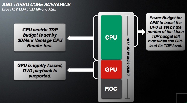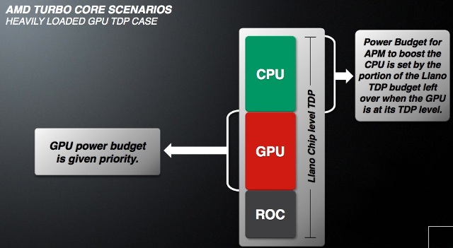In Llano solo la CPU può incrementare il proprio clock, anche se AMD si è riservata la possibilità di poter incrementare anche il clock della GPU in modelli futuri (e sembrerebbe che già il successore di Llano, Trinity, basato su architettura Bulldozer dal lato CPU, possa implementarlo).