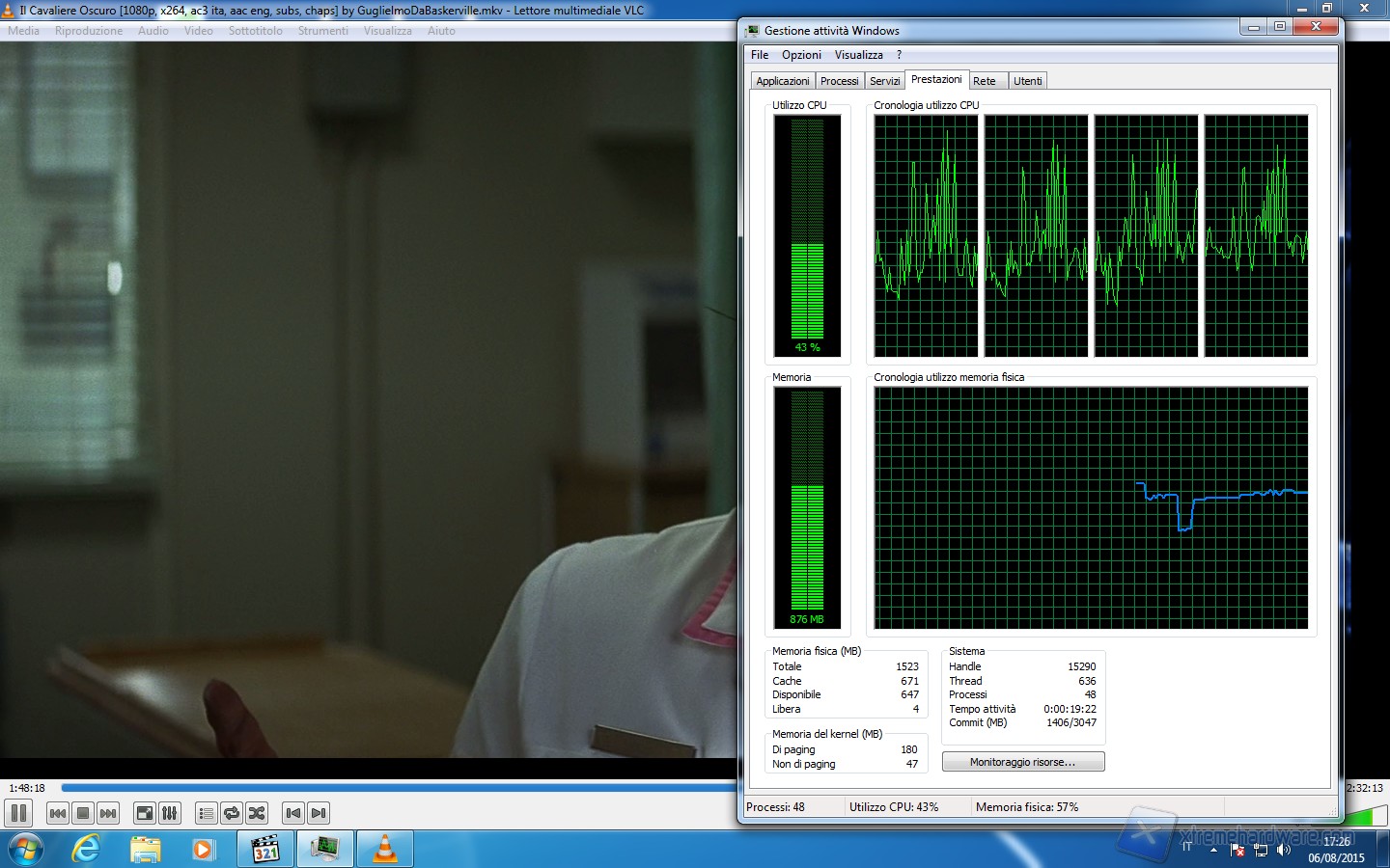 Lanciando un ulteriore film in alta definizione la percentuale di utilizzo schizza al 92% circa, andando praticamente ad occupare tutta la CPU.