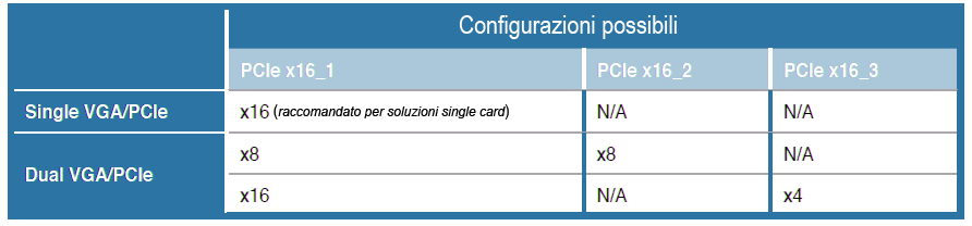 La scheda madre dispone di tre slot PCI Express x16 e di uno slot PCI Express x1. Tale connessione, trovandosi al di sotto dello slot primario dedicato alla scheda video, potrebbe risultare inutilizzabile qualora si dotasse il sistema di una GPU dual slot. In tal caso si potrà ovviare all’inconveniente, sfruttando lo slot PCI Express x16 di colore nero che supporta le modalità x4 e x1.